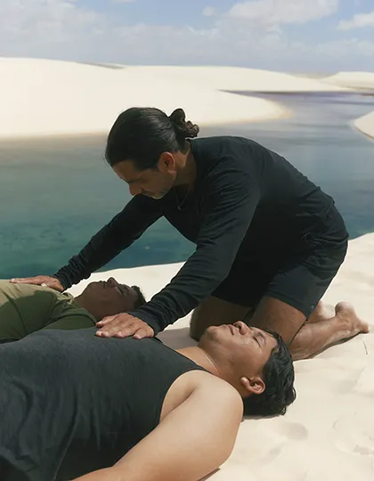 Reconexão com a força do masculino sagrado. Respiração, círculo de homens, silêncio e práticas de autoconhecimento.